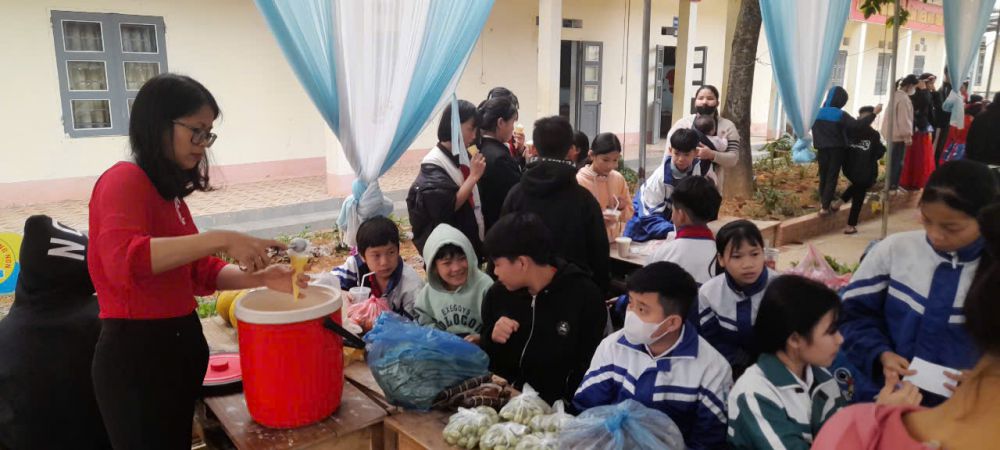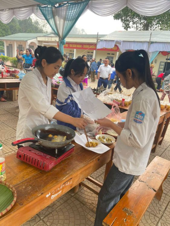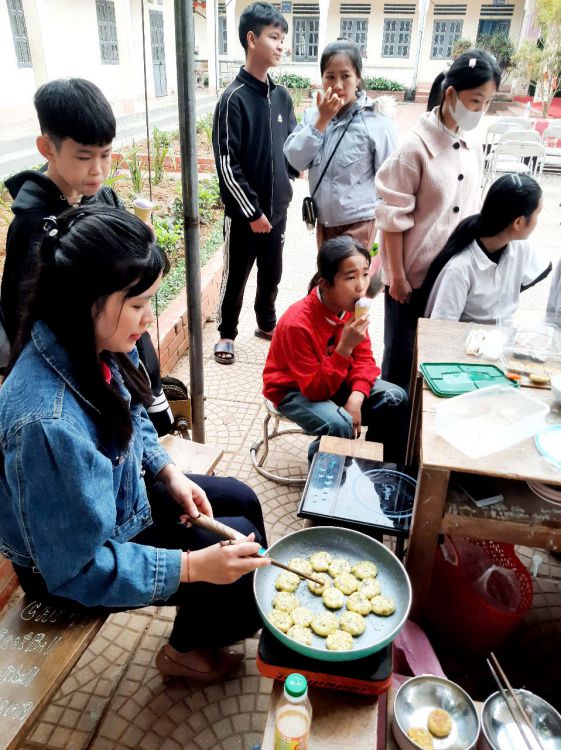 Học sinh toàn trường háo hức với các hoạt động tưng bừng và rộn rã trong hội chợ. Các gian hàng ẩm thực thu hút đông đảo học sinh trong trường đến thưởng thức những món ăn hấp dẫn